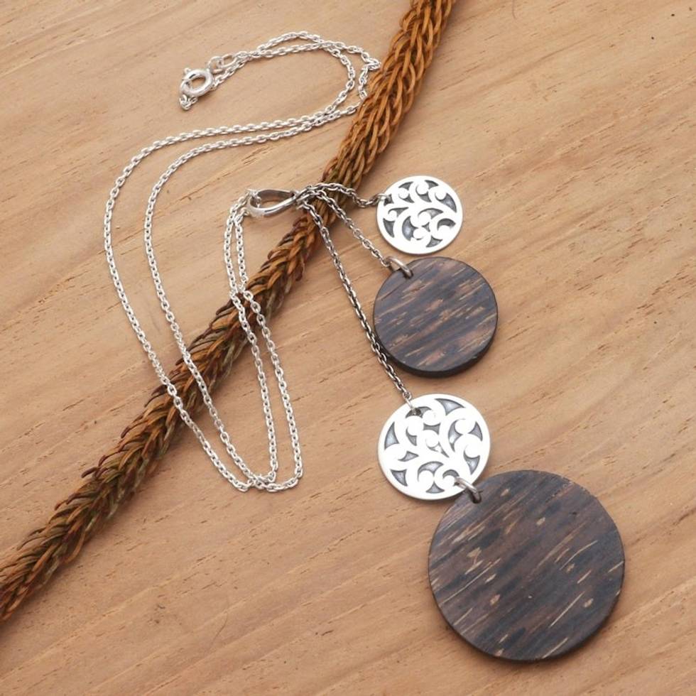 "Named for a city in the East Java region of Indonesia, this y-necklace, featuring two pendants, is presented by Bali's Komang Yut. Discs of coconut wood, rich with texture, provide contrast against high-polish sterling silver openwork discs. The pendants hang from a high-polish cable chain."