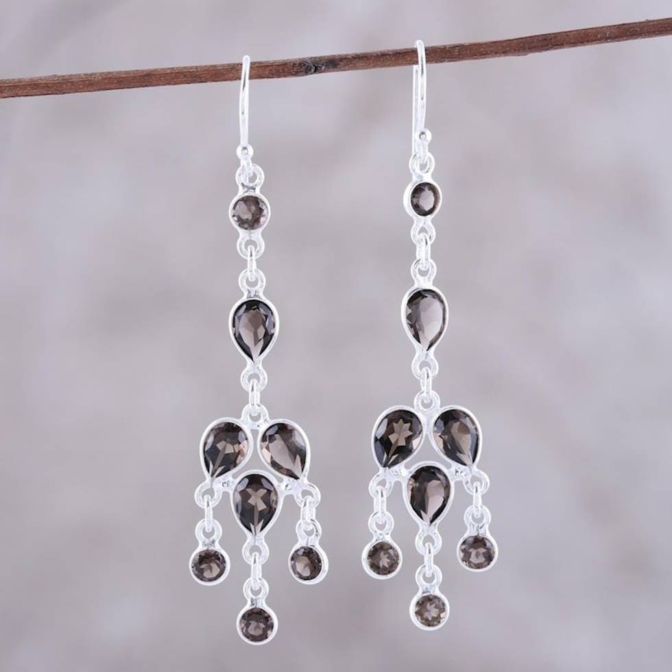 Sterling Silver and Smoky Quartz Chandelier Earrings 'Leafy Adornment' Item ID: 2671792919