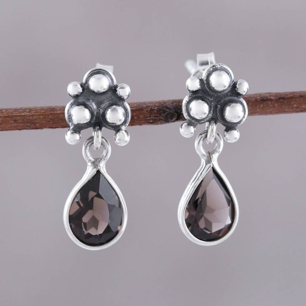 Sterling Silver and Smoky Quartz Dotted Dangle Earrings 'Trinity Glitter' Item ID: 2671792146