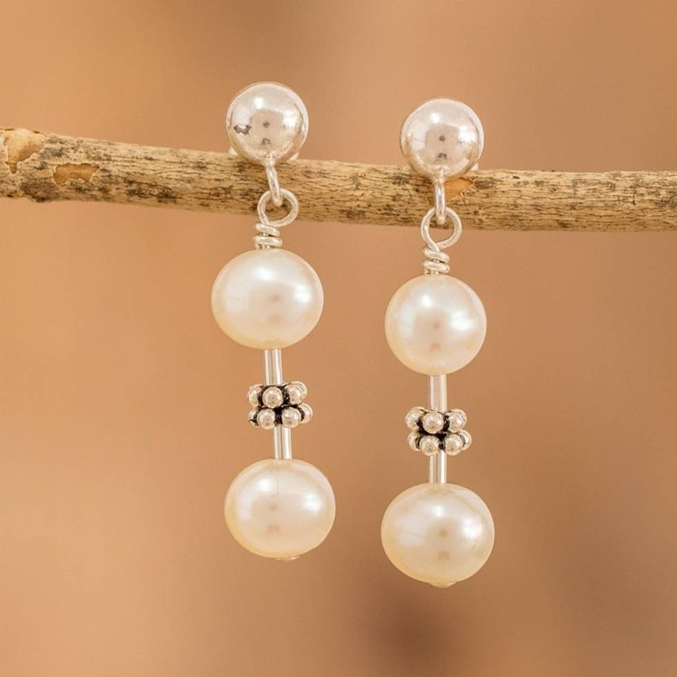 Sterling Silver Beaded Dangle Earrings with Cream Pearls 'Pearly Richness' Item ID: 2671772425