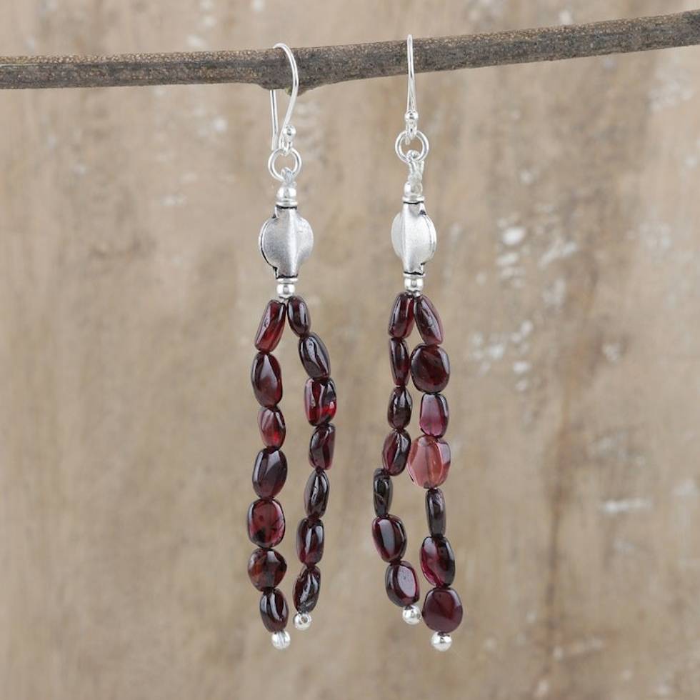 Sterling Silver Beaded Dangle Earrings with Garnet Jewels 'Paths of Devotion' Item ID: 2671786823