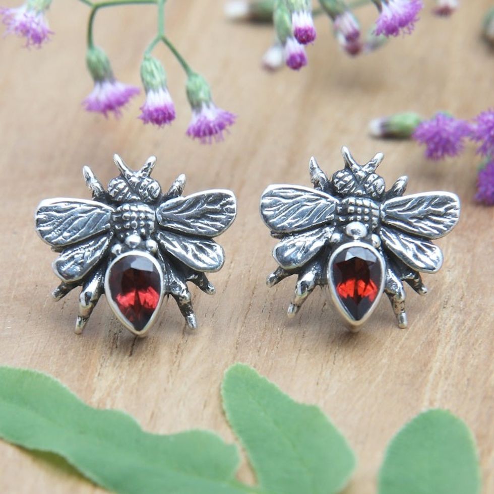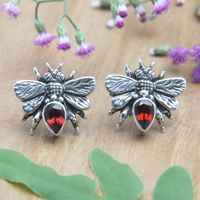Sterling Silver Bee Button Earrings with Garnet Jewels 'Bee Passionate' Item ID: 2671820892