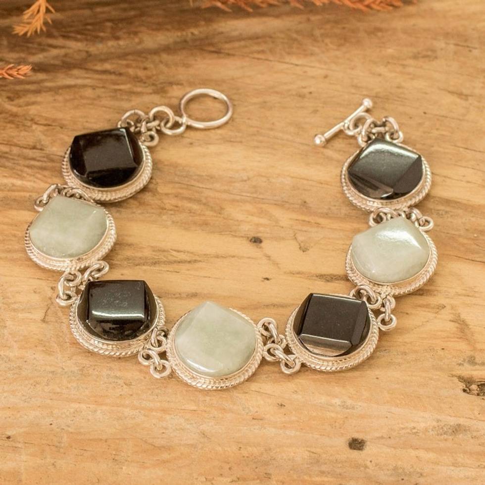 Sterling Silver Black and Apple Green Jade Link Bracelet 'Glamorous Style' Item ID: 2671770728