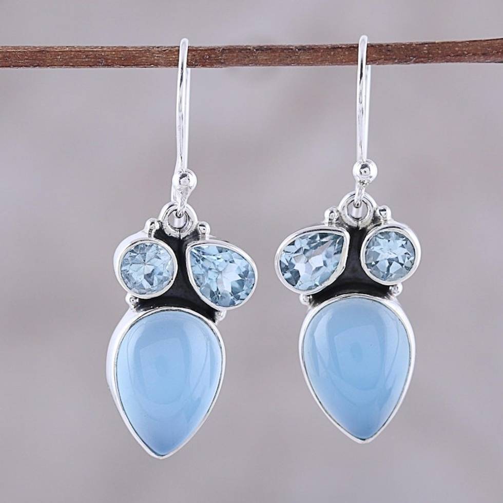 Sterling Silver Blue Topaz and Chalcedony Dangle Earrings 'Oceanic Dazzle' Item ID: 2671792065