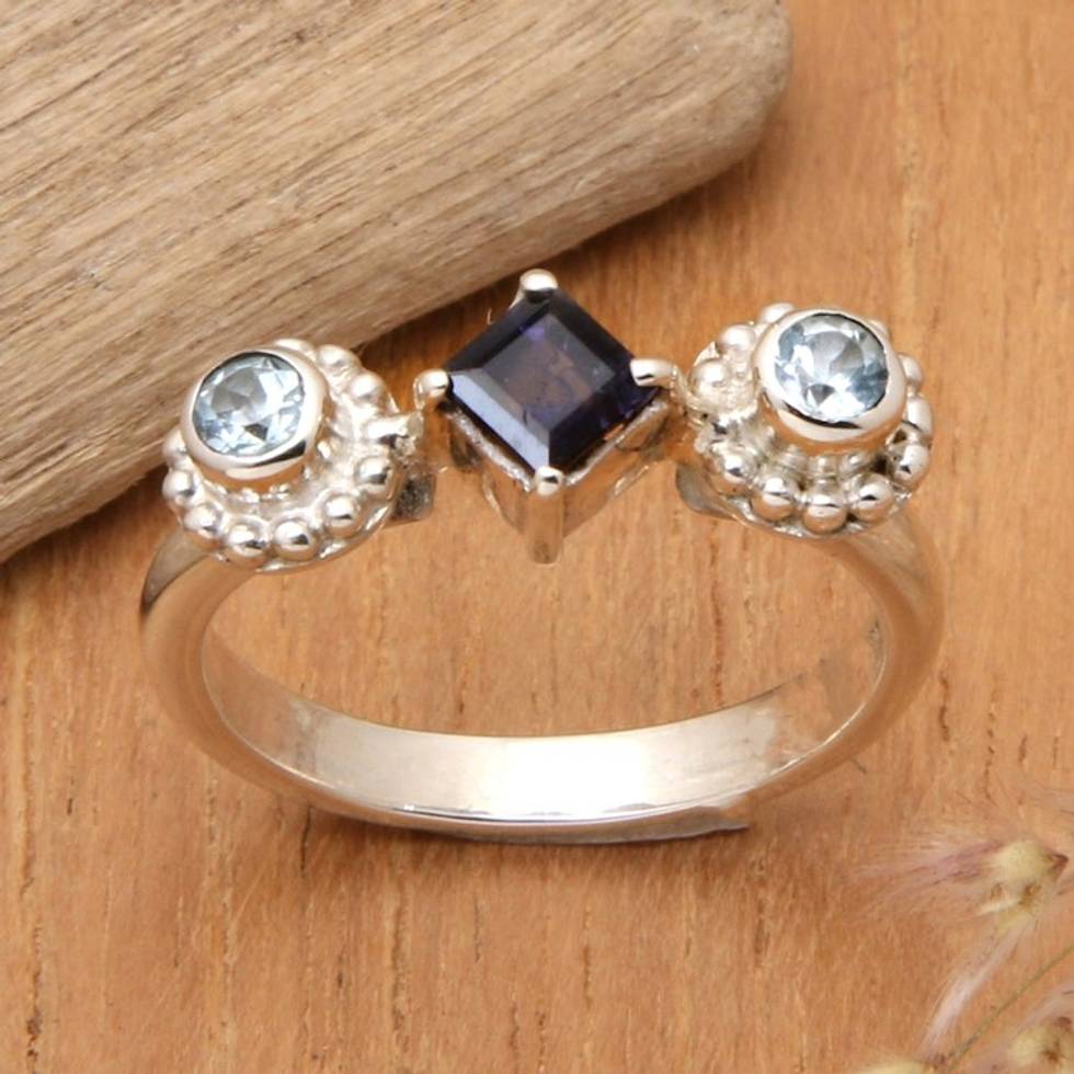 Sterling Silver Blue Topaz and Iolite Faceted Cocktail Ring 'Cool Trio' Item ID: 2671736836