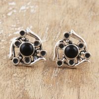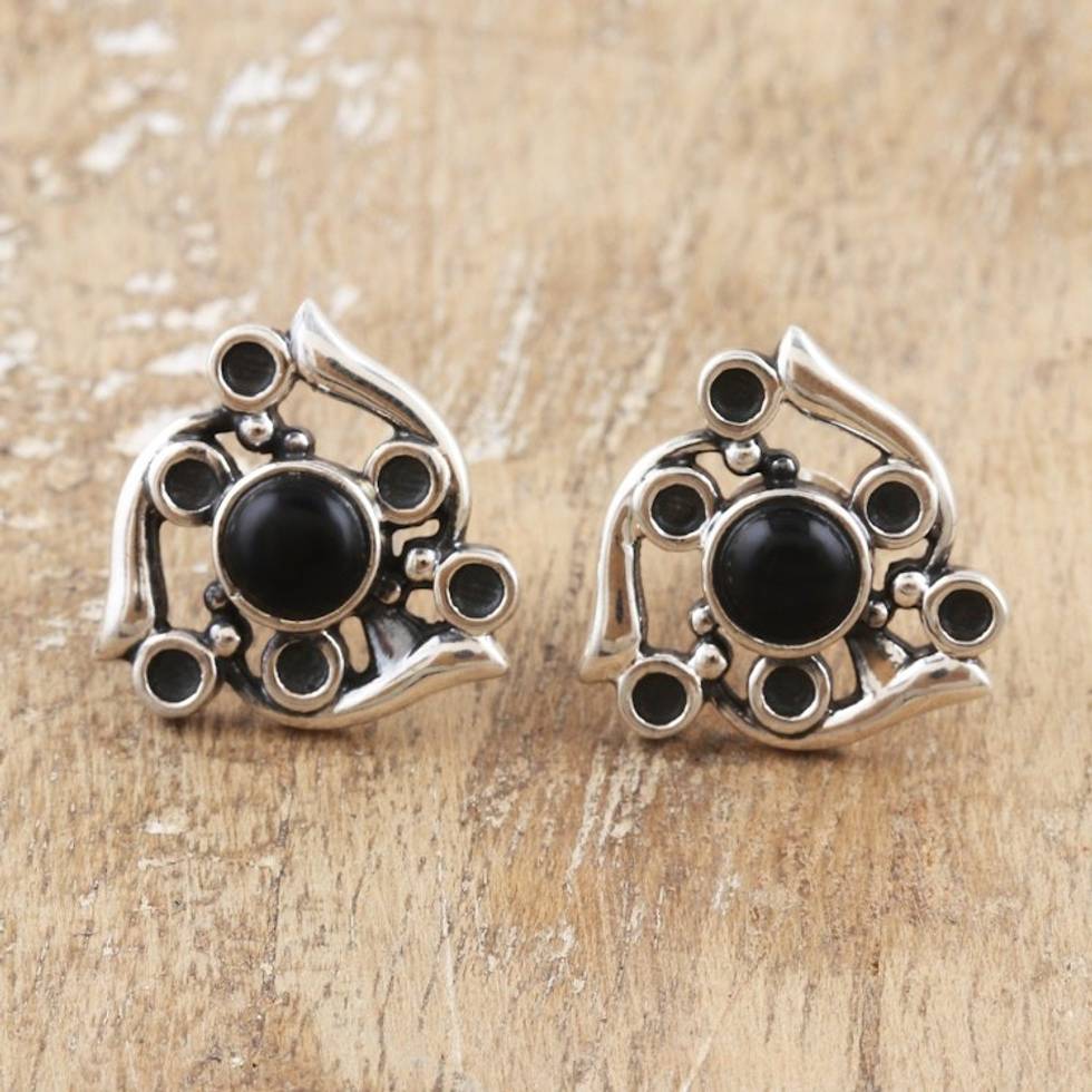 Sterling Silver Button Earrings with Onyx Jewels from India 'Protective Twist' Item ID: 2671786873