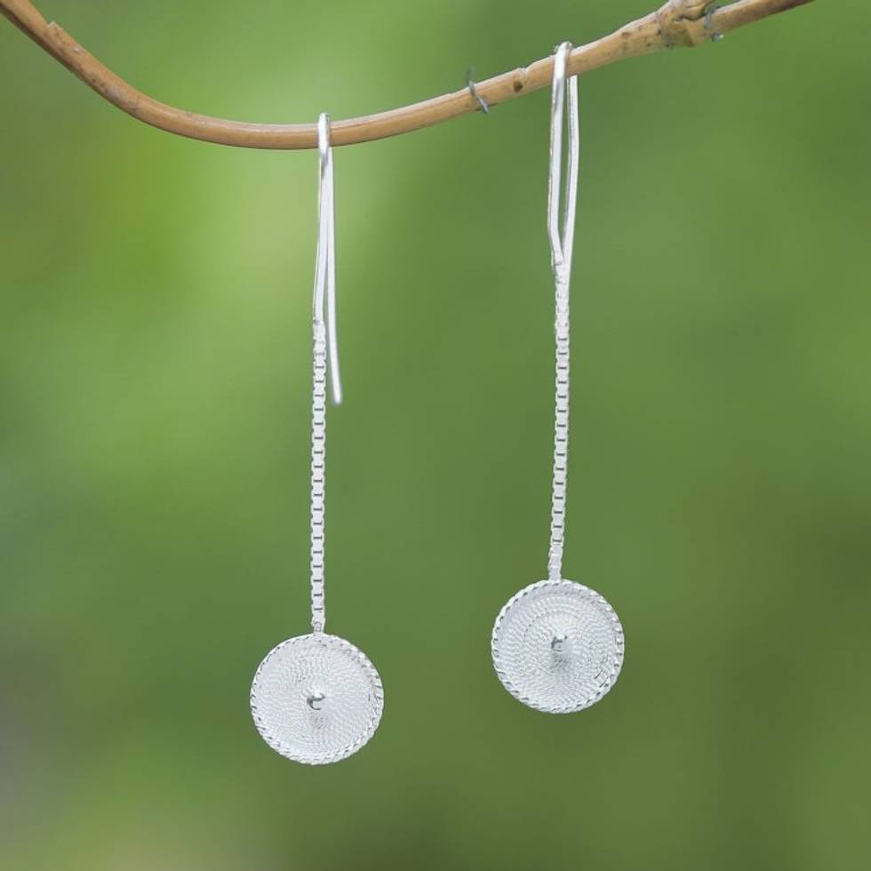 "Antarina employs the concepts of the chakra to create these exquisite earrings. The Sanskrit word translates to 'wheel.' In yoga, this term refers to wheels of energy throughout the body. Two sterling silver discs hang from feminine chains for a touch of elegance."
