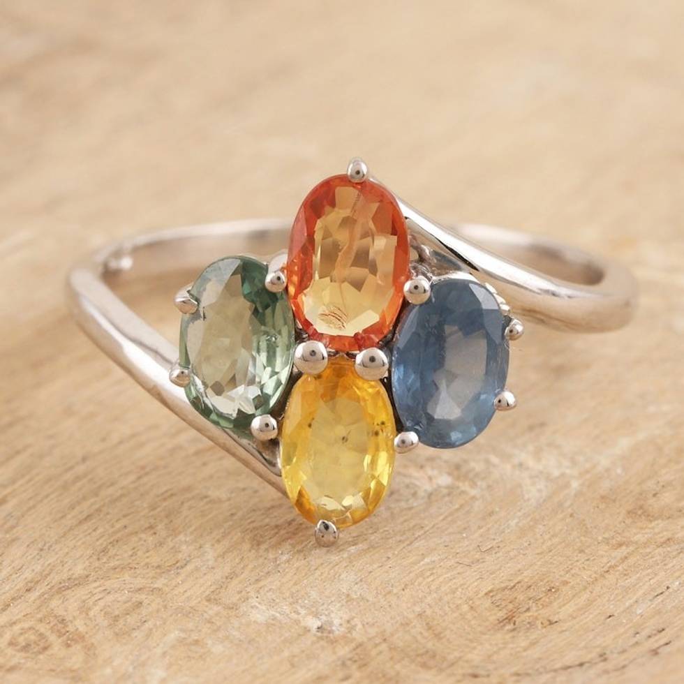 Sterling Silver Cocktail Ring with Four Sapphires from India 'Indian Seasons' Item ID: 2671787818