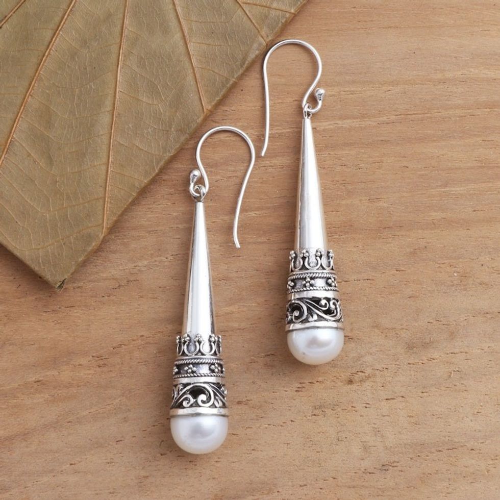 Sterling Silver Cone Dangle Earrings with Cultured Pearl 'Bali Cornet' Item ID: 2669923242