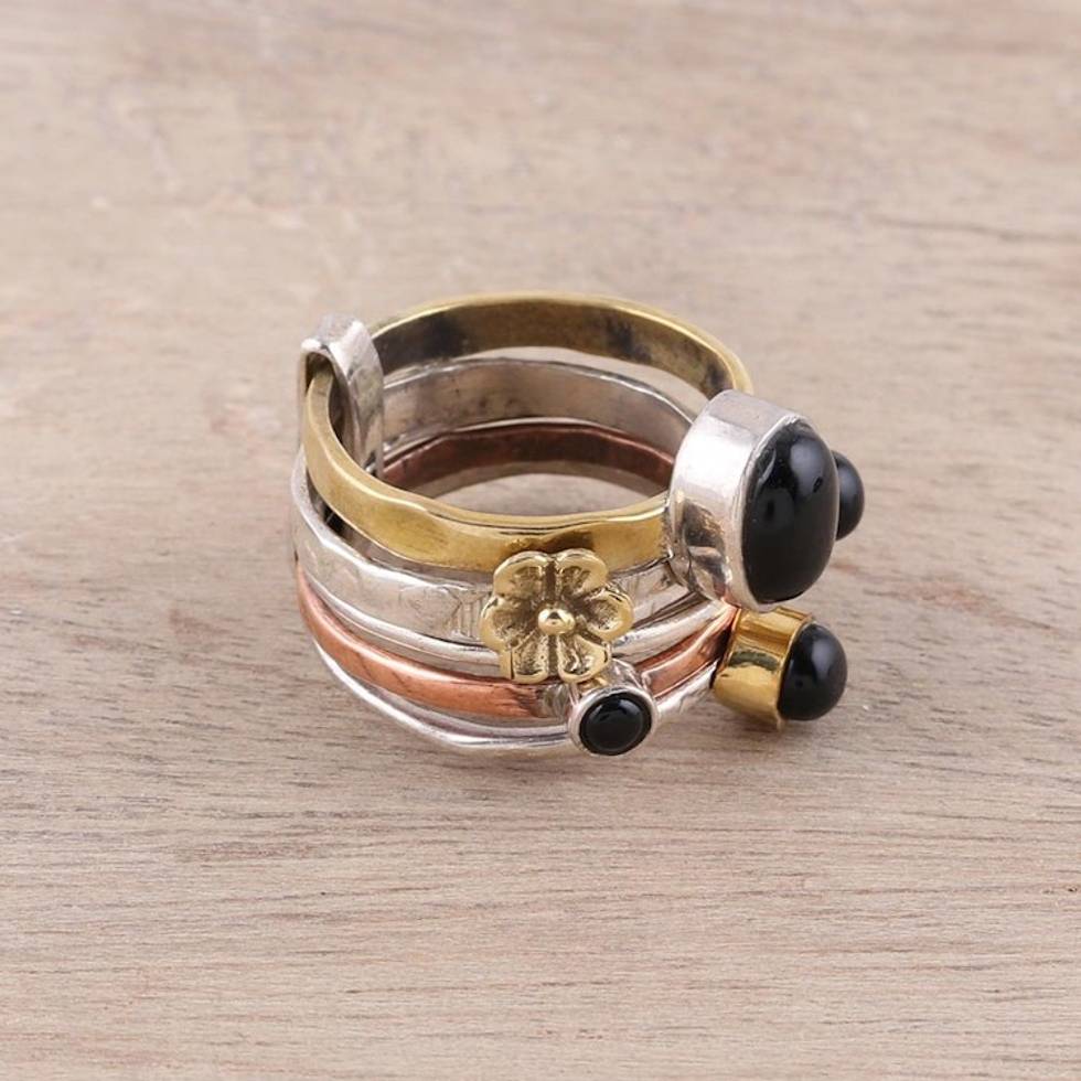 Sterling Silver Copper Black Onyx Cocktail Ring 'Midnight Flowers' Item ID: 2669924972