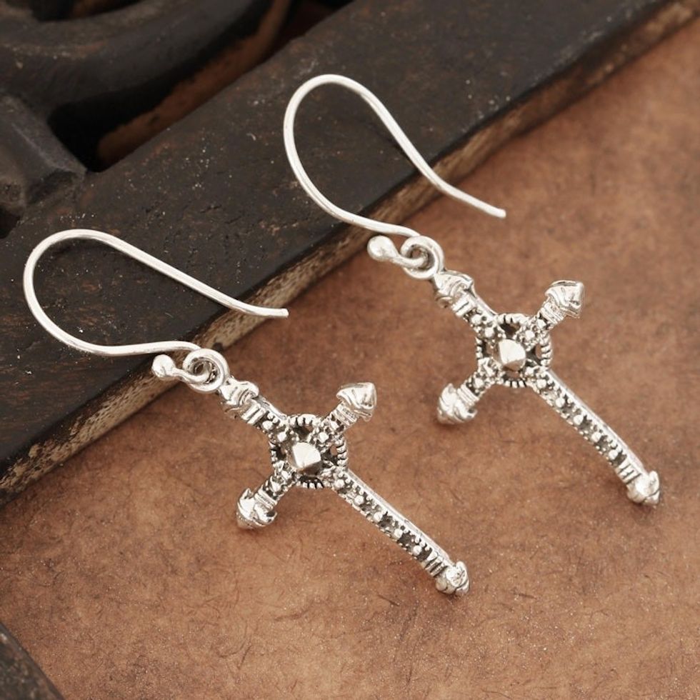 Sterling Silver Cross Dangle Earrings from India 'Faithful Dazzle' Item ID: 2669925097