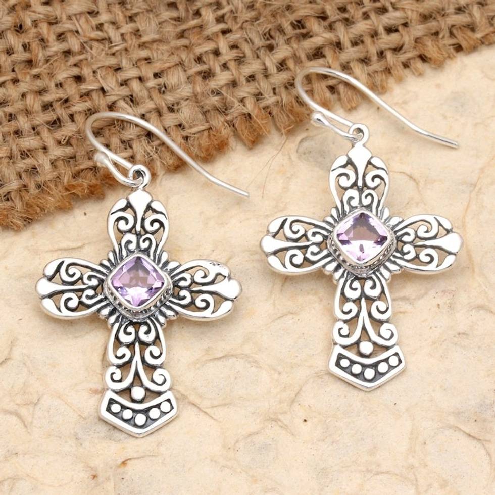 Sterling Silver Cross Dangle Earrings with Amethyst Stones 'Cross of Heaven in Purple' Item ID: 2671765518