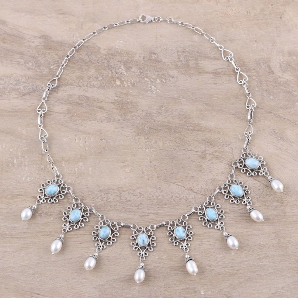 Sterling Silver Cultured Pearl and Larimar Necklace 'Ocean Halo' Item ID: 2669956010