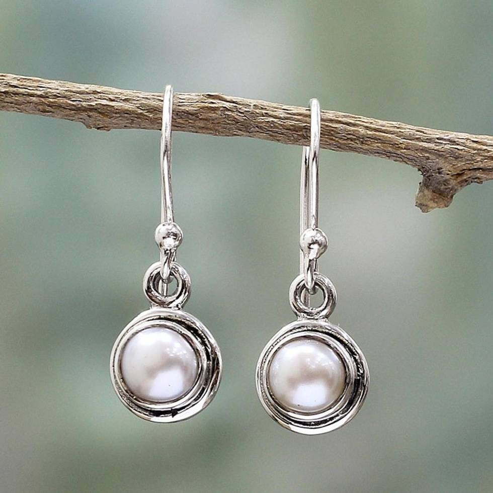 Sterling Silver Cultured Pearl Dangle Earrings from India 'Purest Love' Item ID: 2669923839