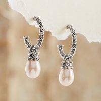 If you love pearls and or silver, do not hesitate to get this. This is absolutely gorgeous and looks as pretty or even better in person. The detailing and the non flashy understated beauty of this earing can not be stated more. I will be buying more for some relative who loves hoops. These are light weight and the backs hold very well. The pearls do have the slight rose tone to them - almost like an ivory with a tad bit of rose. Highly highly recommended. Can we dressed up or down. I wear it to work and on special outfits with ease