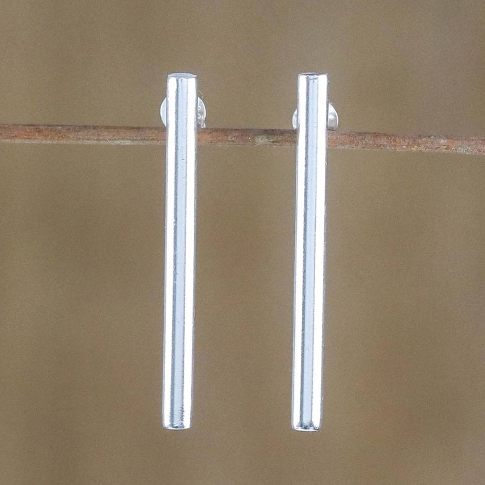 Sterling Silver Cylindrical Drop Earrings from Thailand 'Gleaming Pillars' Item ID: 2671801508