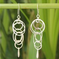 "Sterling hoops interconnect in the dynamic design of these earrings. Finishing with silver droplets, the handcrafted earrings come from Withaya Cheunjit's collection.