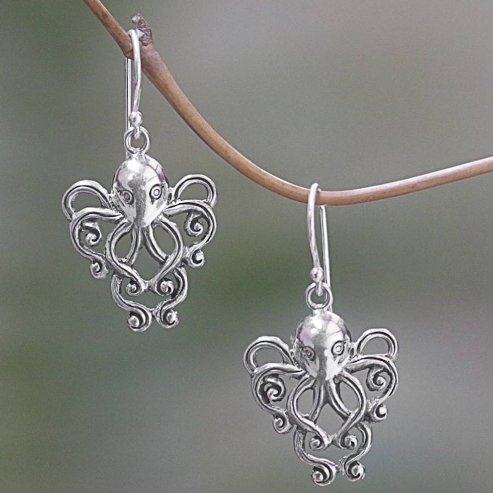Sterling Silver Dangle Earrings Octopus from Indonesia 'Octopus of the Deep' Item ID: 2669923233