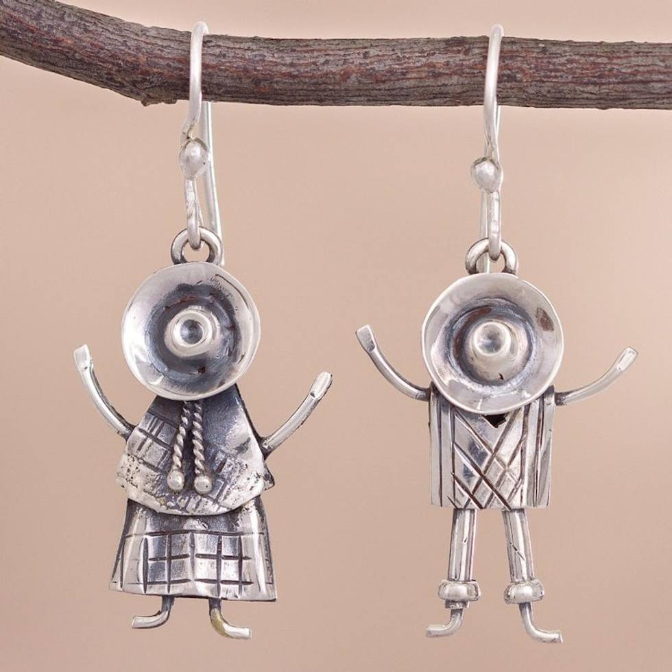 Sterling Silver Dangle Earrings of Andean People from Peru 'Cuzco Love' Item ID: 2671399497