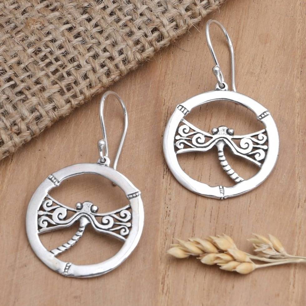 Sterling Silver Dangle Earrings with Dragonfly Motif 'Dragonfly Playground' Item ID: 2671748520