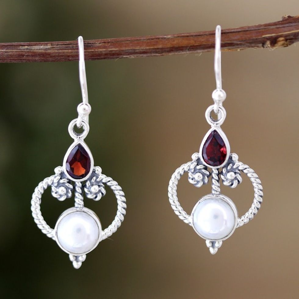 Sterling Silver Dangle Earrings with Pearls and Garnet Gems 'Crimson Mansion' Item ID: 2671786765