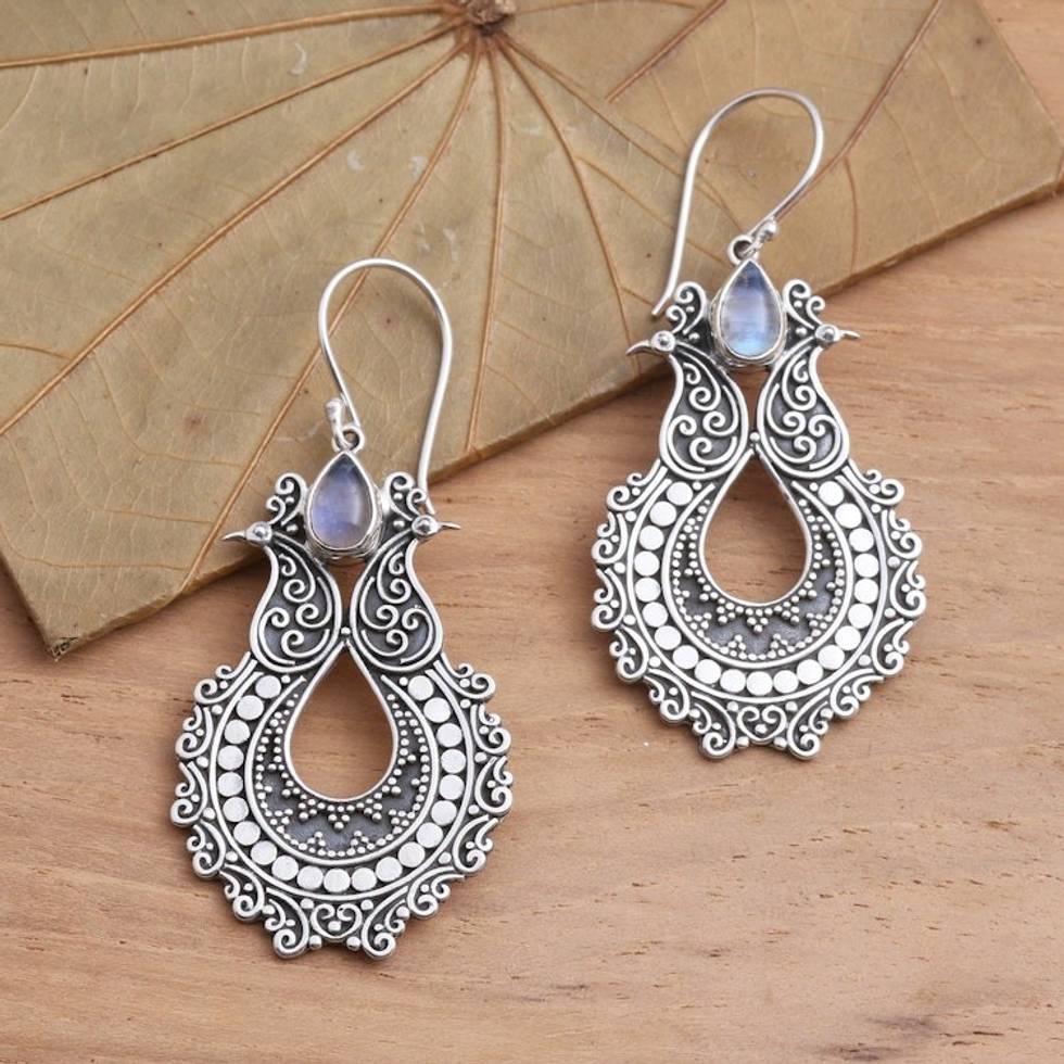 Sterling Silver Dangle Earrings with Rainbow Moonstone 'Sky's Heart' Item ID: 2671744923