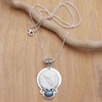 'Sleepy Moon', pendant necklace needed to have to be seen worn with a sterling silver chain before I could see the pendant's beauty. The chain I am using is shorter than the black, material chain that came with the pendant. The shorter chain, 16", is good because the pendant is more noticeable at this length. The citrine on the pendant I received is much lighter than pictured and does not have sparkle. The pendant a silver chain is still beautiful. I have dangle earrings that have the moon face, also have the cow bone ring, 'Face if the Moon', and 'Ocean Soul' bracelet. May try wearing all of these Buana's jewelry together. The darker color around the face, even though in a tiny area, is a good artistic, design effect. Also the silver decoration adds texture to the design which makes the pendant interesting and eye catching. Happy with all Buana's moon face jewelry items.