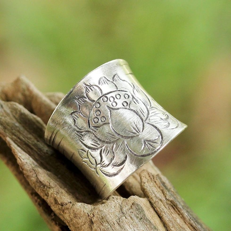 Sterling Silver Etched Lotus Wrap Ring from Thailand 'Lanna Lotus' Item ID: 2669928489