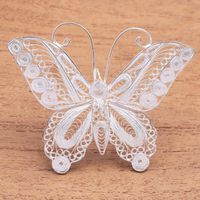 "Crafted by hand, intricate ribbons of sterling silver filigree are used to create this image of a lovely butterfly with curled antennae. Javanese artisan Selly Sagita creates this artisanal and beautiful brooch."