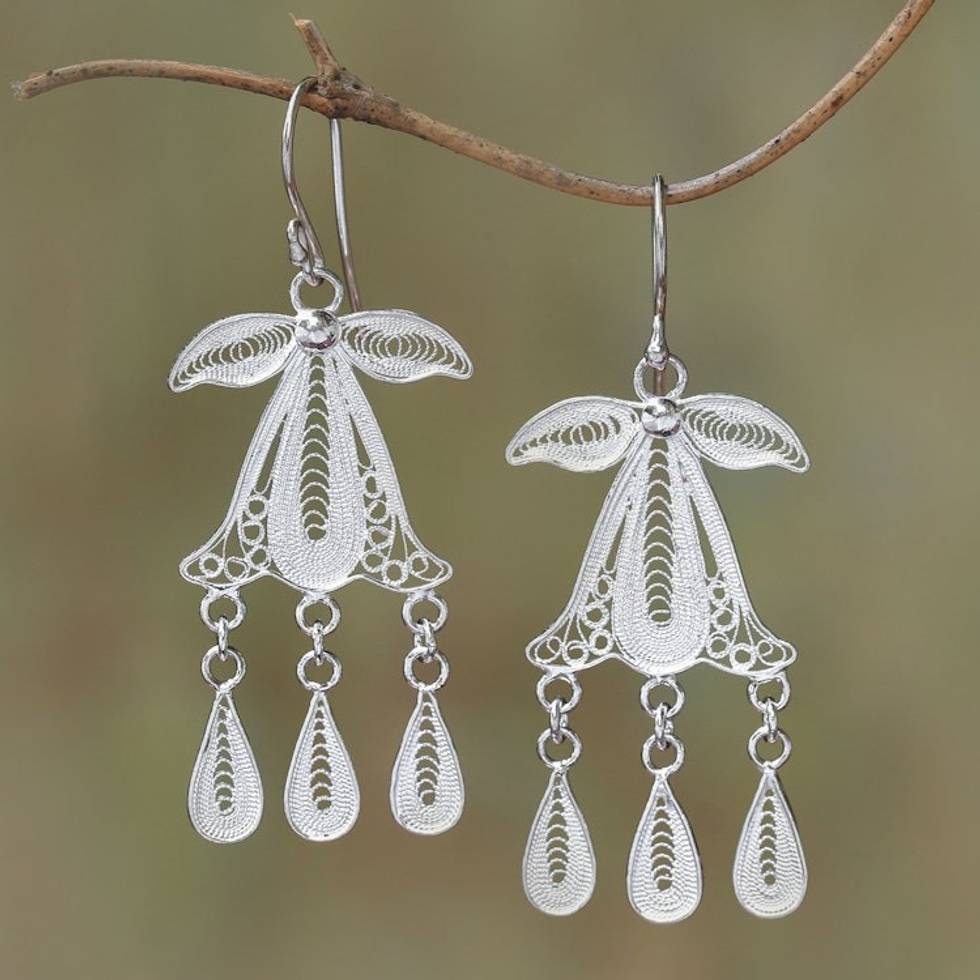 Sterling Silver Filigree Dangle Earrings Crafted in Java 'Gombyok Leaf' Item ID: 2671736435