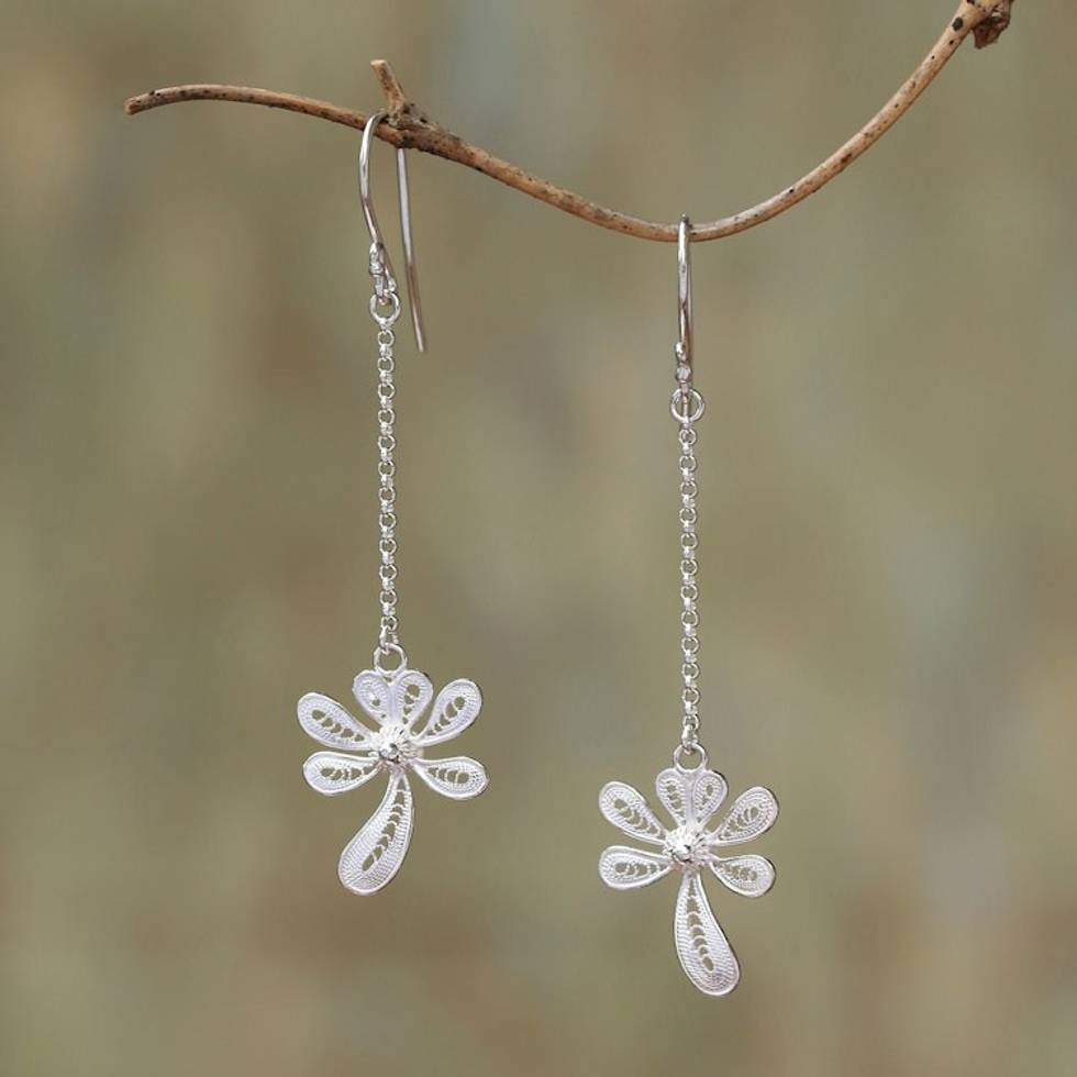 Sterling Silver Filigree Dangle Earrings Crafted in Java 'Wondrous Kinjeng' Item ID: 2671736673