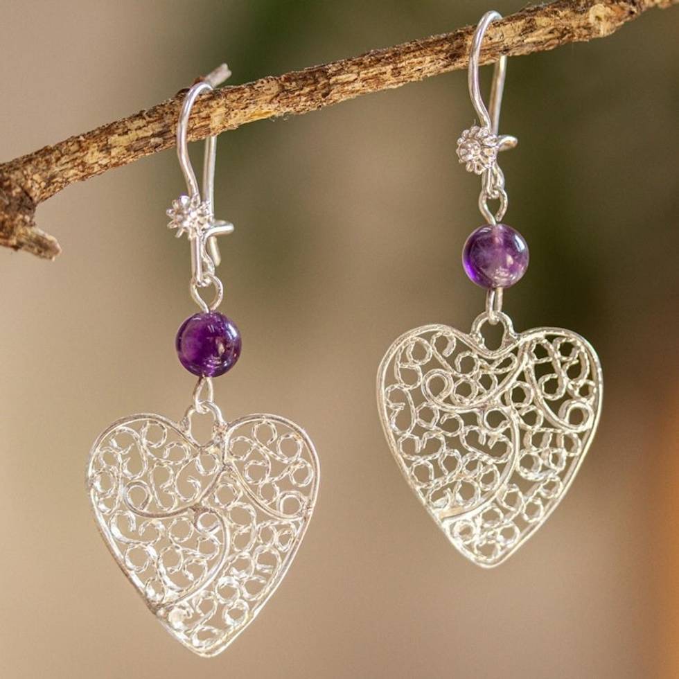 Sterling Silver Filigree Dangle Earrings with Amethyst 'Ethereal Harmony' Item ID: 2671808234