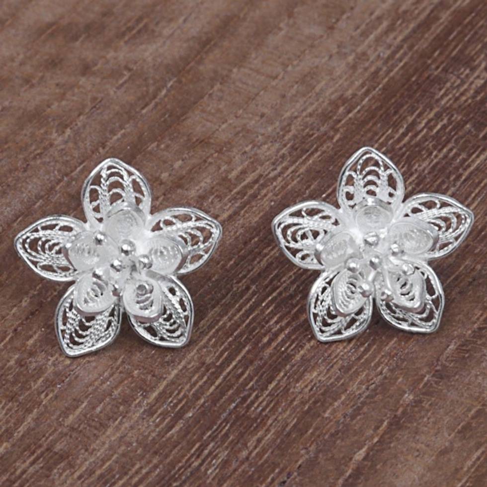 Sterling Silver Floral Filigree Button Earrings Indonesia 'Enticing Blossoms' Item ID: 2671480735