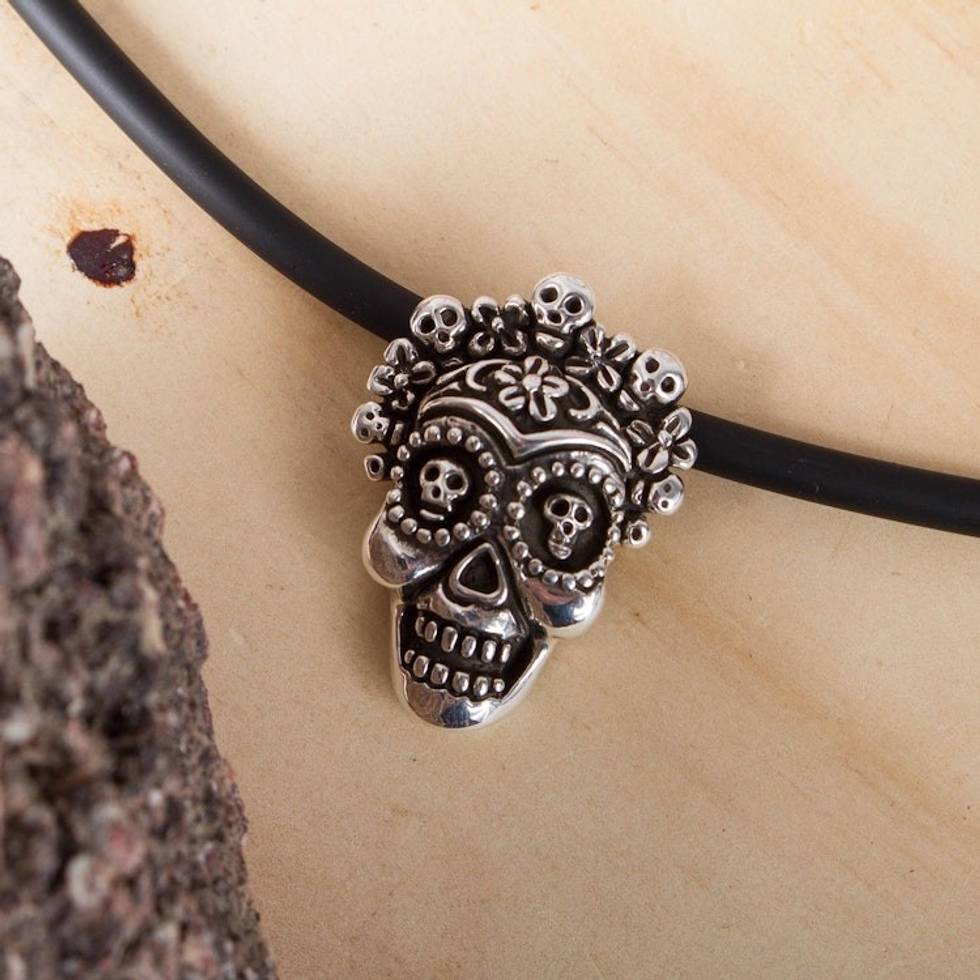 Sterling Silver Floral Skull Pendant Necklace from Mexico 'Calavera la Comadre' Item ID: 2669932196