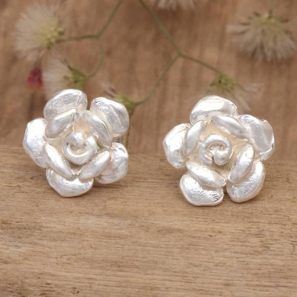 Sterling Silver Floral Stud Earrings with Sandblasted Finish 'Blooming Glam' Item ID: 2675253270