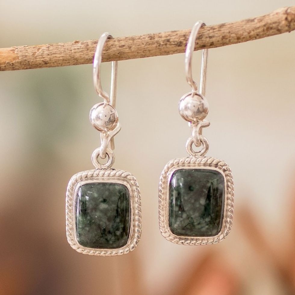 Sterling Silver Guatemalan Dark Green Jade Dangle Earrings 'Green Life Divine' Item ID: 2671626574