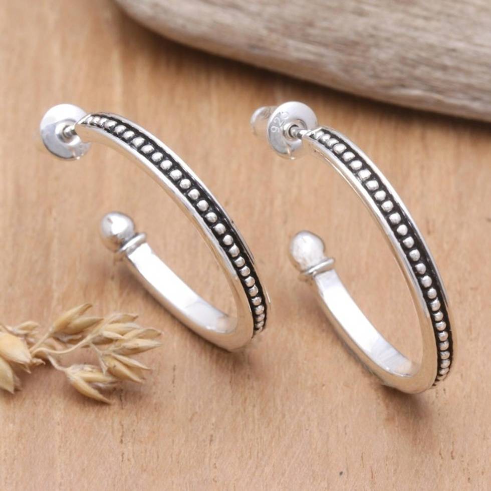 Sterling Silver Half-Hoop Earrings with Dotted Pattern 'Dotted Curves' Item ID: 2671763088