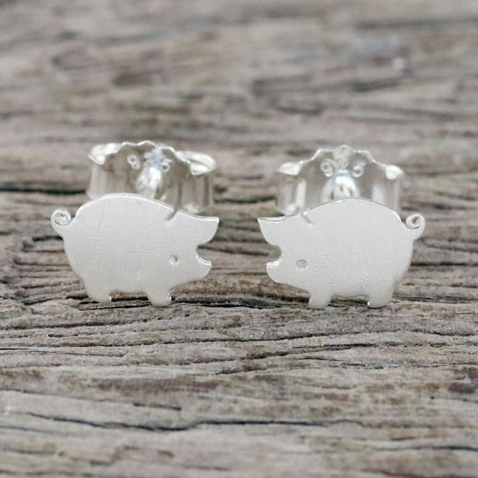 Sterling Silver Hand Crafted Pig Shaped Stud Earrings 'Whimsical' Item ID: 2671801121