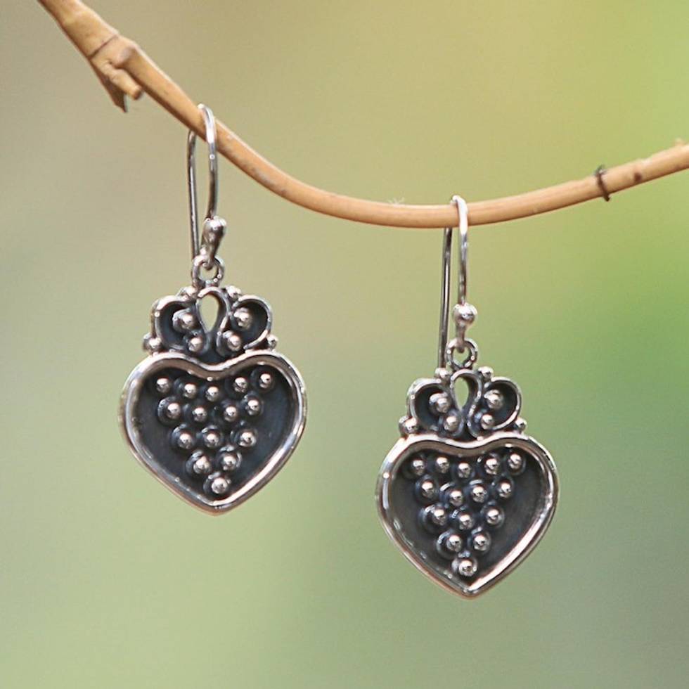 "Sweet and sophisticated, these sterling silver heart earrings are overflowing with a dainty dot motif. Artisan Made Darmada of Bali handcrafts this lovely pair of dangle earrings."