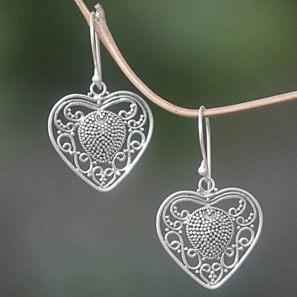 Sterling Silver Heart Dangle Earrings from Indonesia 'Heart-Shaped Offering' Item ID: 2671701781