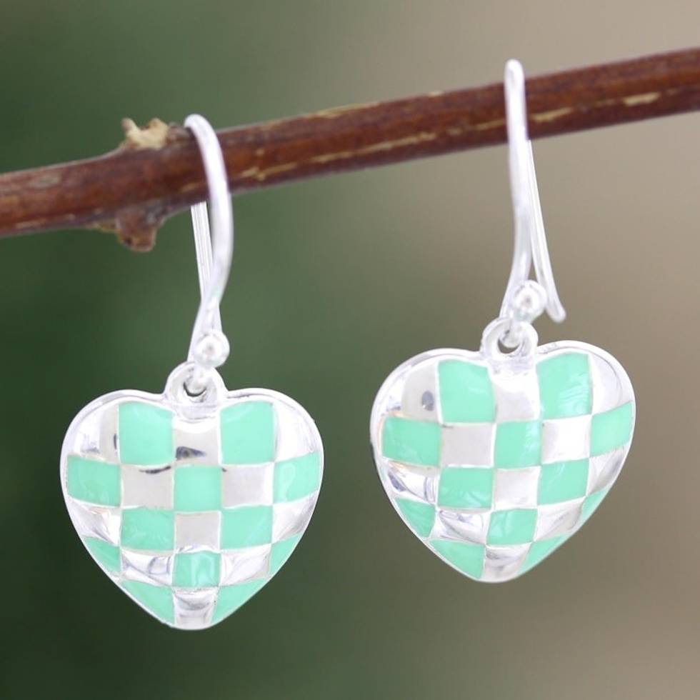 Sterling Silver Heart-Motif Dangle Earrings 'Checkered Heart in Green' Item ID: 2671788984