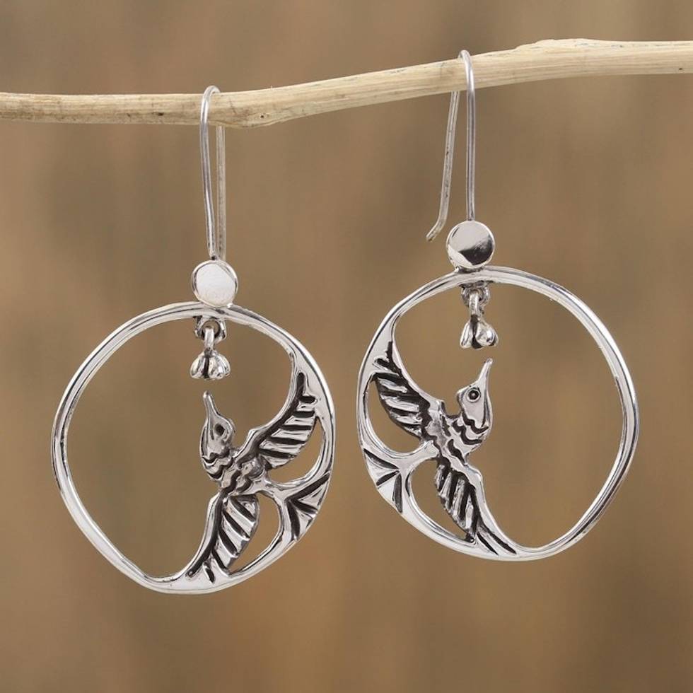 Sterling Silver Hummingbirds in Circle Frame Dangle Earrings 'Delicate Hummingbird' Item ID: 2671808557