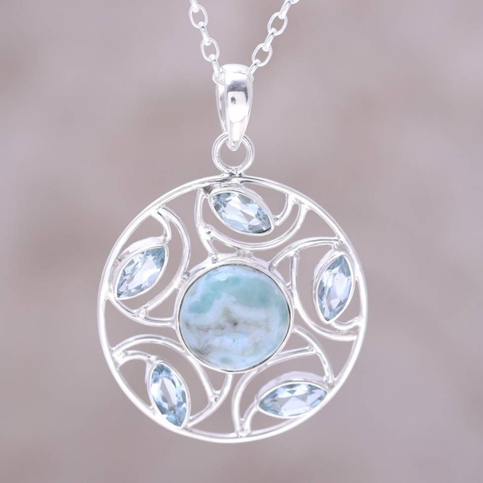 Sterling Silver Larimar Blue Topaz Round Pendant Necklace 'Blue Wheel' Item ID: 2669955752