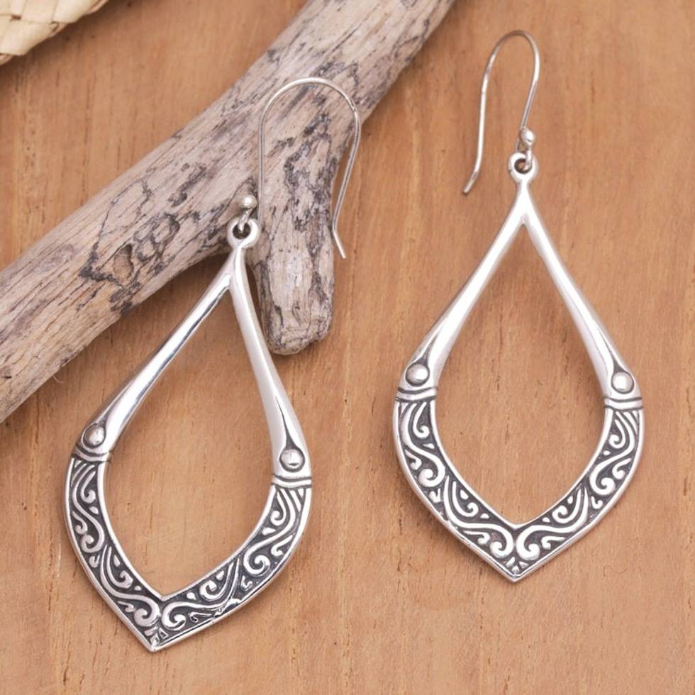 Sterling Silver Leaf Dangle Earrings with Traditional Motifs 'Bali's Leaf' Item ID: 2671747886