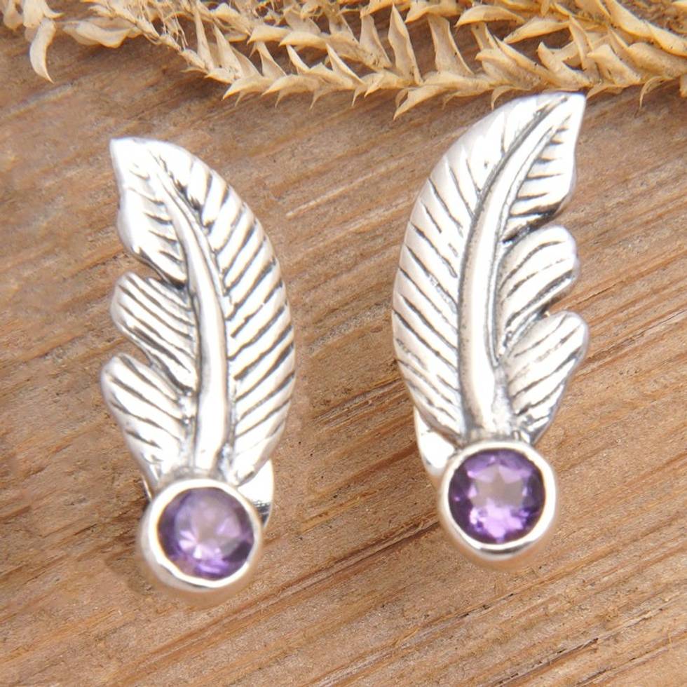 Sterling Silver Leaf Stud Earrings with Amethyst Stone 'Petite Feather' Item ID: 2669923329