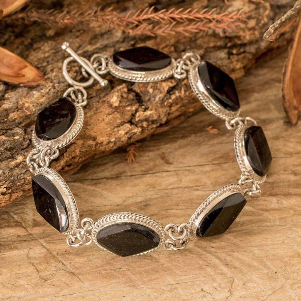 Sterling Silver Link Bracelet with Oval Black Jade Stones 'Faceted Ovals' Item ID: 2671769127