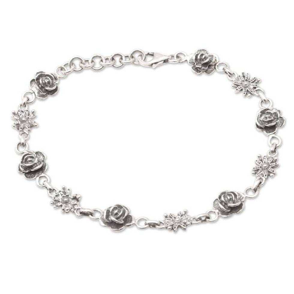 Sterling Silver Link Bracelet with Roses and Blooms 'Passion Garden' Item ID: 2676657392
