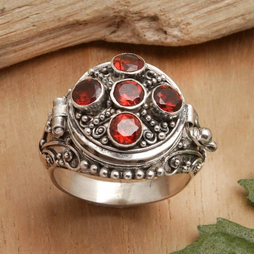 Sterling Silver Locket Ring Topped with 5 Garnet Stones 'Candlelight Red' Item ID: 2671764899