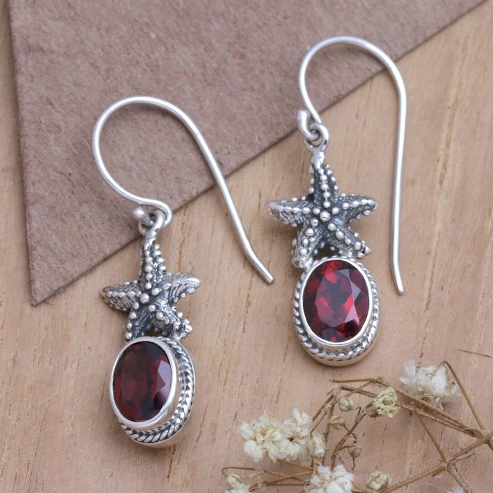 Sterling Silver Marine Dangle Earrings with Garnet Gemstones 'Passionate Star' Item ID: 2669921459