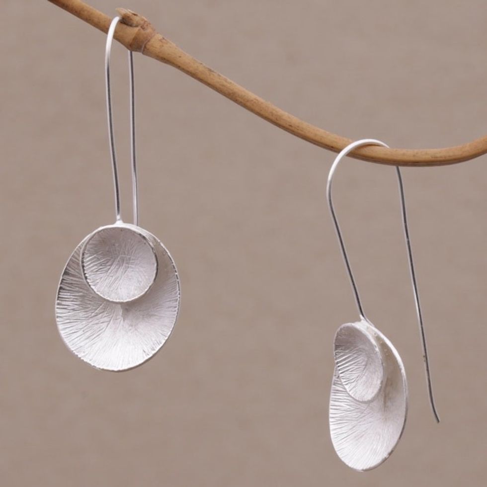 I knew I liked brushed silver, how the light plays off the matte finish is a covert way, almost playing with the eye. And I appreciated the arrangement of the shapes of silver in the design. What delighted me was the unanticipated movement of the design! These earrings are beautiful, lightweight, with exquisite movement and light play. My new favorite! [the photos do not do justice to these beautiful earrings]